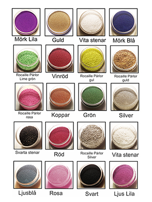 Det finns olika färger att välja i form av stenar, pårlor & torkade växter